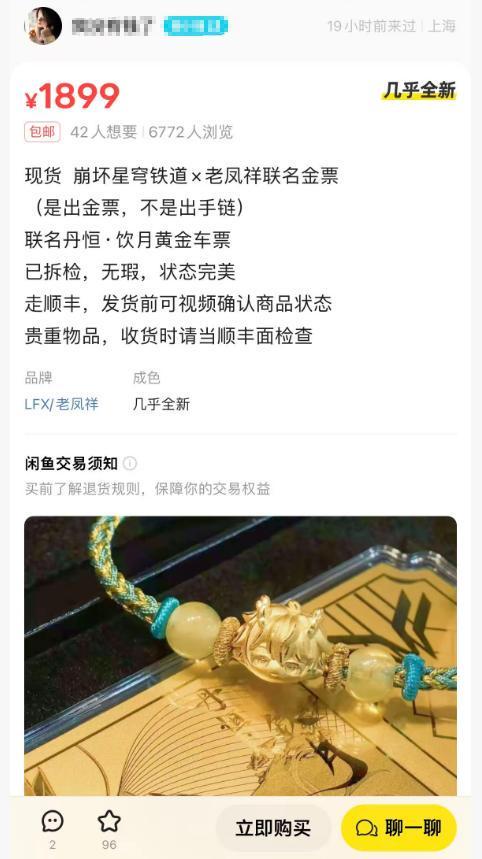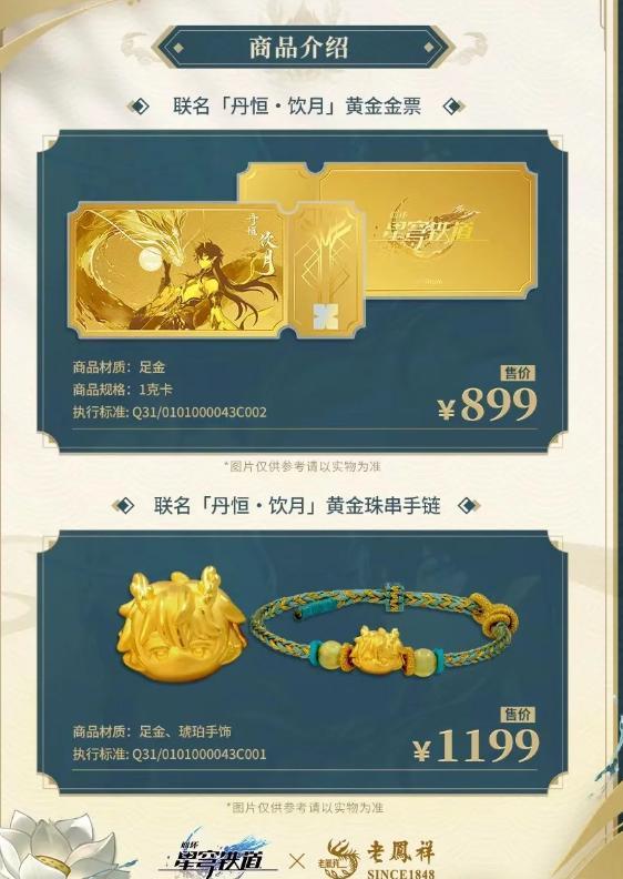 早在去年,星穹铁道联动老凤祥推出联名活动“浮光跃金,龙凤呈祥”,包含了两款饮月君的黄金周边,一款是黄金金票,重量为1克,售价899元,另一款是饮月黄金串珠手链,重量1.15克,售价为1199元,全都是足金999。