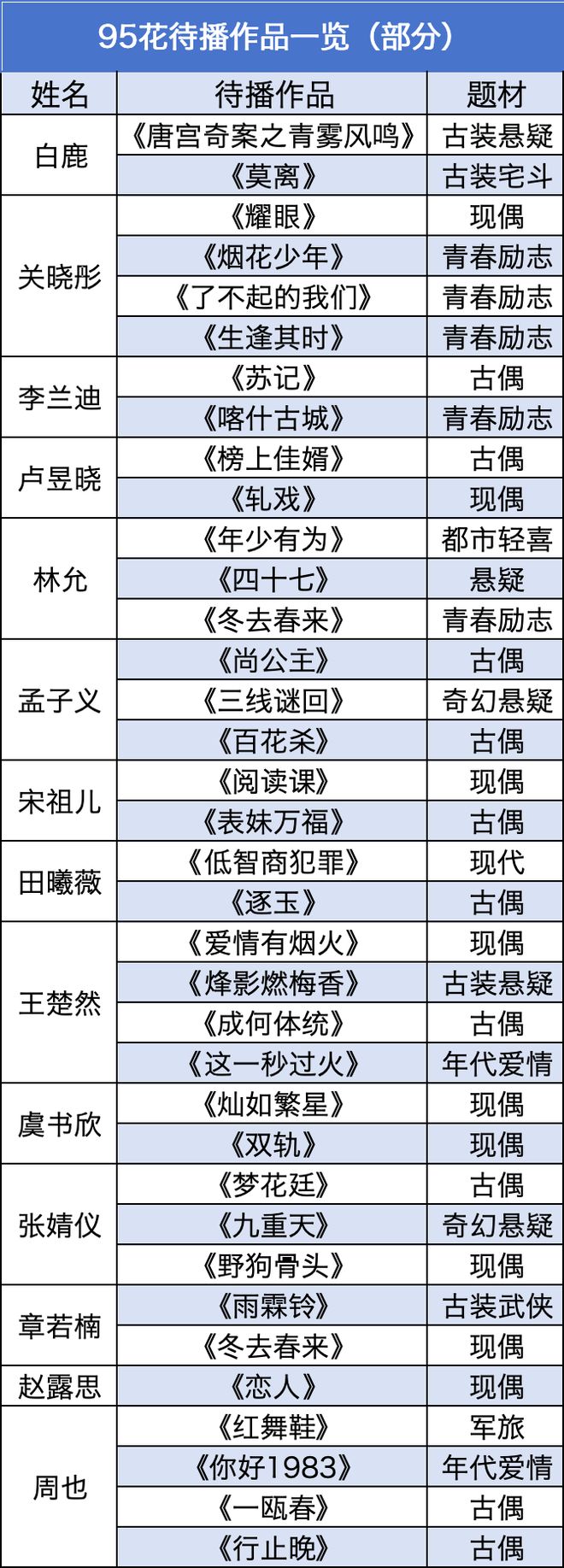 比如“仙侠劳模”白鹿的待播剧是古装悬疑剧《唐宫奇案之青雾风鸣》和古装宅斗剧《莫离》;青衣路线的关晓彤带来青春励志剧《烟花少年》《了不起的我们》《生逢其时》;章若楠除了一部鲜偶还将带来一部武侠巨制;林允三部剧分别为都市轻喜剧、悬疑剧、青春励志剧。