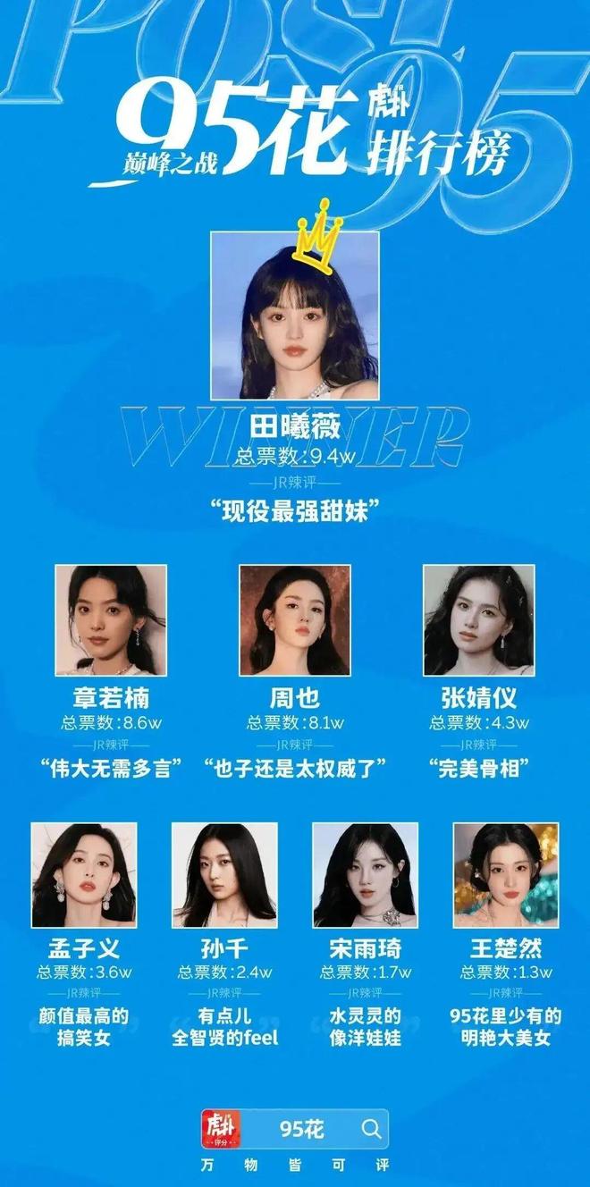 但在作品和流量飞速更迭的近两年,95花的排位不断变化。今年年中,虎扑发起了“巅峰95花”票选,基于颜值、身材、作品、奖项四大维度进行PK。最终,田曦薇以9.4w夺冠,章若楠、周也、张婧仪分别位列二、三、四名。值得注意的是,虎扑评选是大众评选,结果基于虎扑用户的主观喜好。