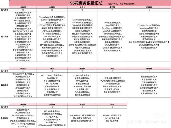 从品牌合作层面看,95花商业价值相对于85、90花而言,相对逊色,二八效应也更明显。除了作品外,95花们的商业合作还与所在经纪公司资源以及个人粉丝黏息相关。比如,手握Dior、巴黎欧莱雅、TASAKI塔思琦中国区等高端品牌合作的周也来自和颂传媒;拥有兰蔻、卡地亚、TOD’S、Burberry合作的张婧仪隶属东申童话旗下;收获GUCCI、娇兰两大品牌的田曦薇是浩瀚星盘的艺人;林允虽作品不够突出,但因靓丽的外形和不错的粉丝粘性也收获Dior、修丽可、SK-II、雅诗兰黛高端品牌以及高端美妆的青睐。