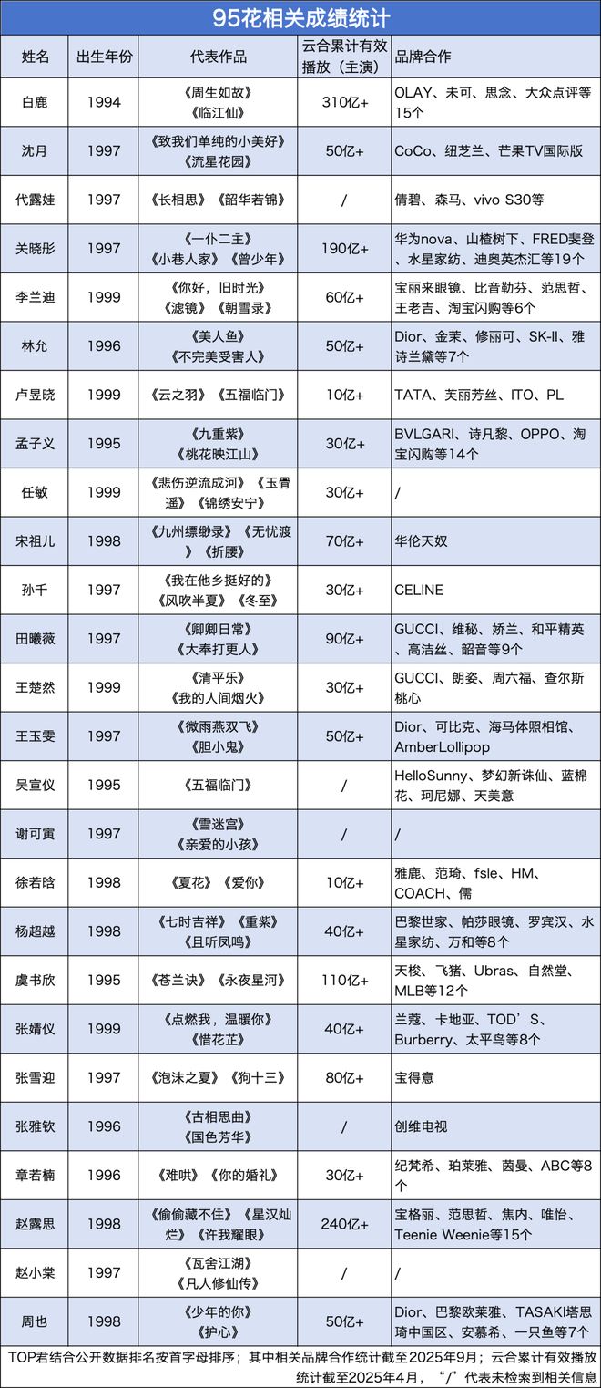 一方面,昔日95花“双顶流”缺位,其中赵露思未提名、虞书欣不在核心名单中;另一方面,94年出生的白鹿因作品爆红周期与95花高度重合被纳入pk阵营,引发多方粉丝不满。
