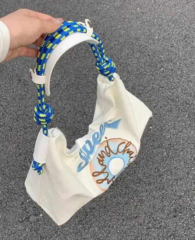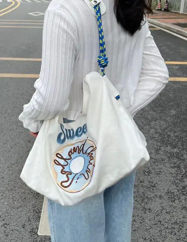 ,日常出门需要用的东西,水杯、雨伞、补妆包也能装下。甜甜圈刺绣包背法有很多种,可以