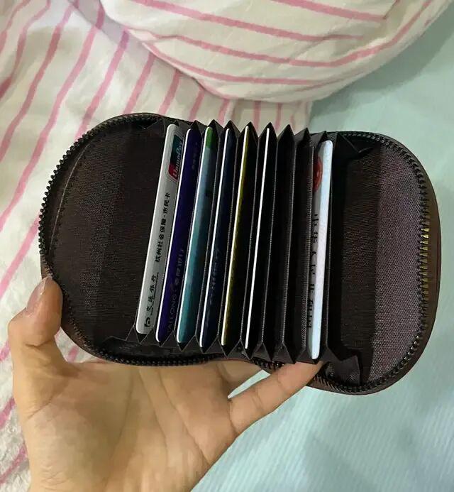 ,它里面是风琴式的,很好收纳,可以装下身份证、银行卡、公交卡等一包就够,平时出门装耳机、纸巾、口红小样等很方便。